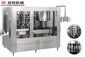 三合一灌装机用于灌装各种调味品、酒类、纯净水、矿泉水、果汁、茶饮料等不含气体的物料,在一机上可以实现冲瓶、灌装、封盖。...