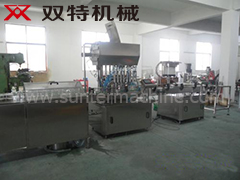 江阴双特机械有限公司结合当前酒酿行业产品的生产工艺要求研制出一条新型灌装设备。工艺流程:人工把空瓶放到理瓶机上理瓶→洗瓶→灌装→旋盖→包装平台→理瓶→贴标→包装......